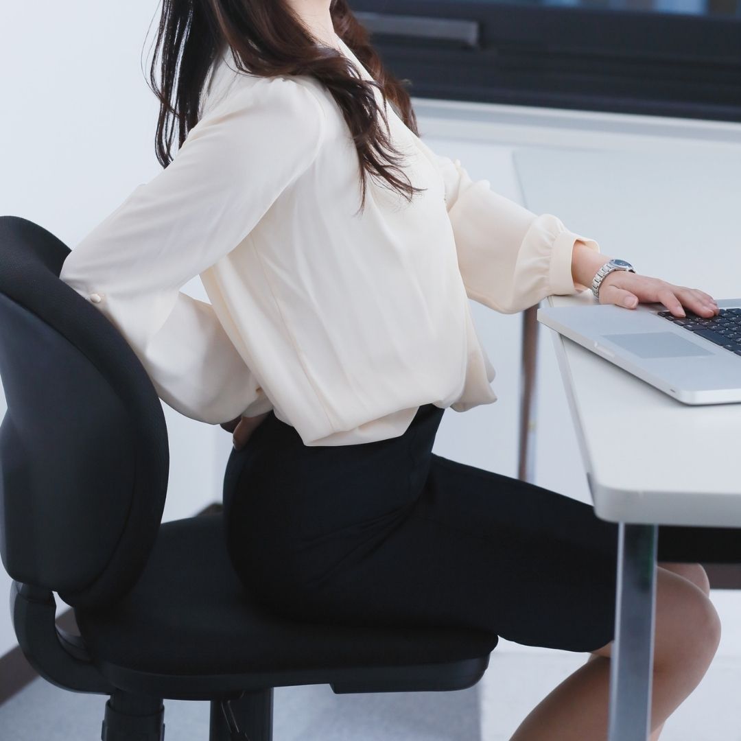 特にデスクワーク中心の方は骨盤が後ろに傾く「後傾姿勢」になる人が多いのですが、背もたれに寄りかかって座る時間が長いほど、お尻の筋肉が休眠状態になります。