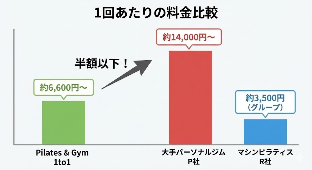 グループレッスンのピラティスよりは高いですが、「完全個室マンツーマン」でこの価格は、業界の常識を覆すレベルです。