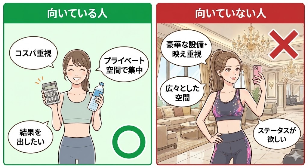 「はっきり言います。『映え』よりも『結果と安さ』を取るなら、ここ以上の選択肢はありません。逆に、ジムに通うこと自体をファッションやステータスの一部として楽しみたい方には向きません。1to1は、あくまで『自分の体を変えるための作業場』として割り切れる、堅実な女性のためのジムです」